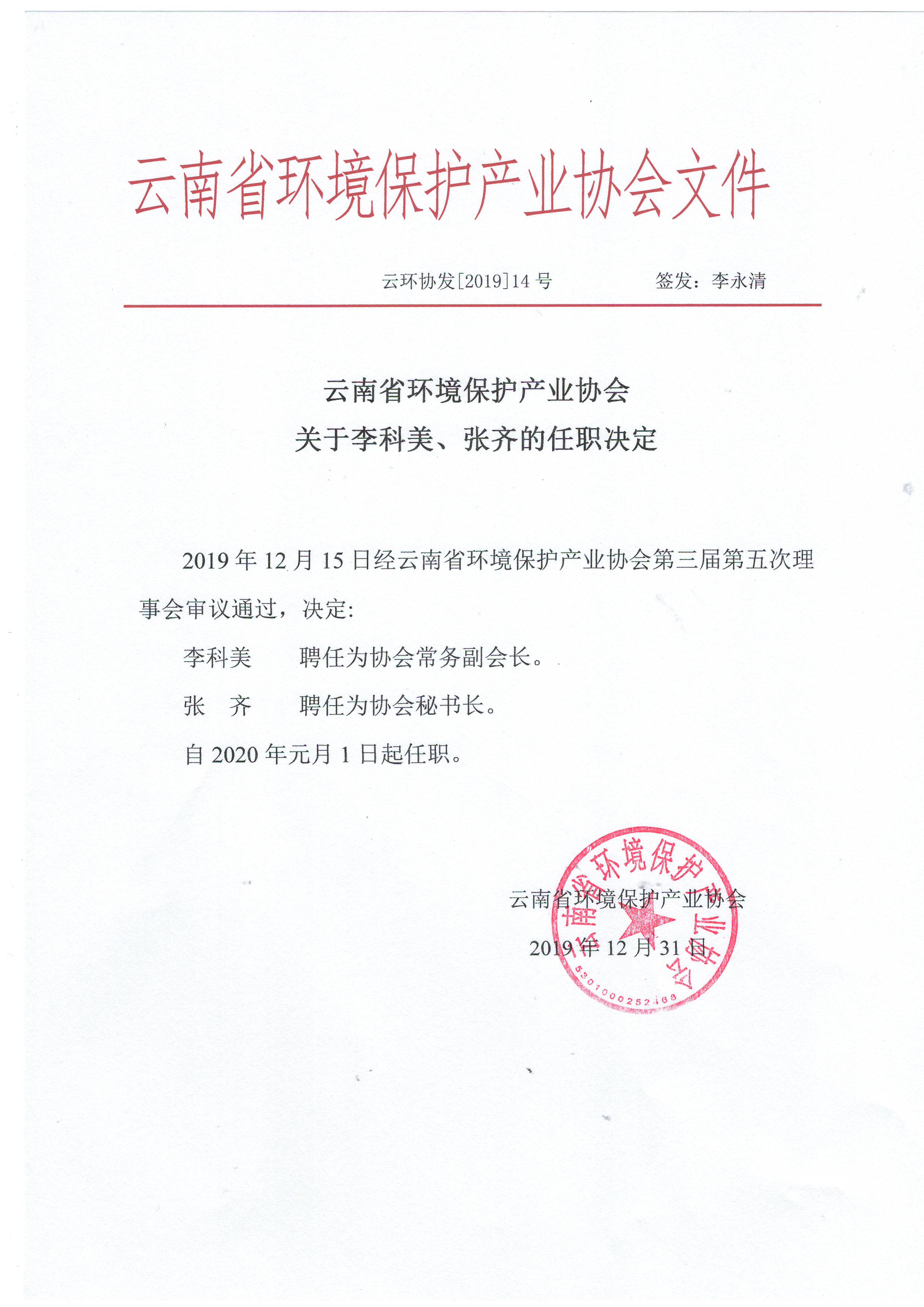 云南省環(huán)境保護產(chǎn)業(yè)協(xié)會關(guān)于李科美、張齊的任職決定