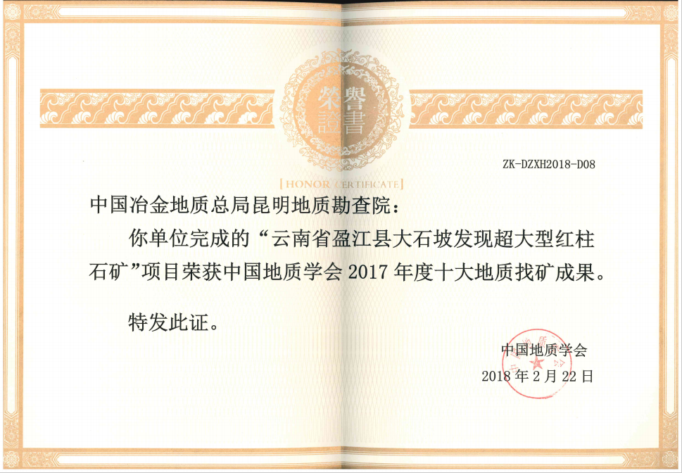 2018年2月22日,昆明地質(zhì)勘查院完成的“云南省盈江縣大石坡超大型紅柱石礦”項目獲得中國地質(zhì)學(xué)會2017年度“十大地質(zhì)科技進(jìn)展、十大地質(zhì)找礦成果”獎。